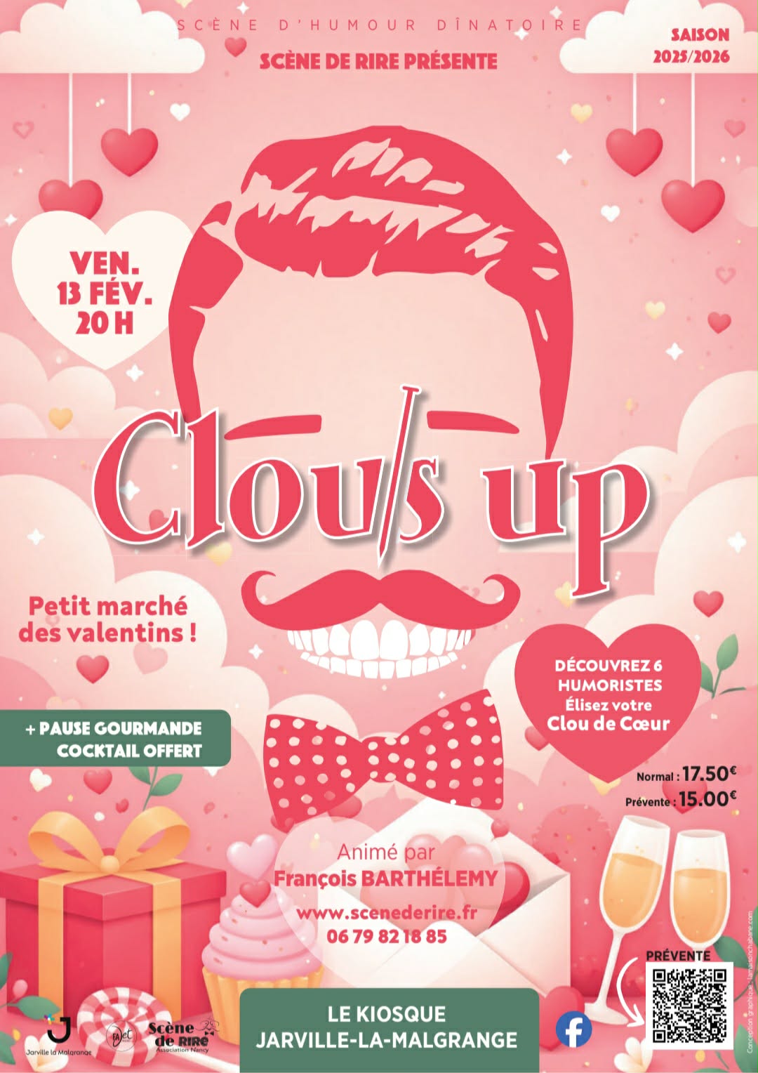 Billetterie : https://www.helloasso.com/associations/scene-de-rire/evenements/clou-s-up-scene-d-humour-dinatoire-2