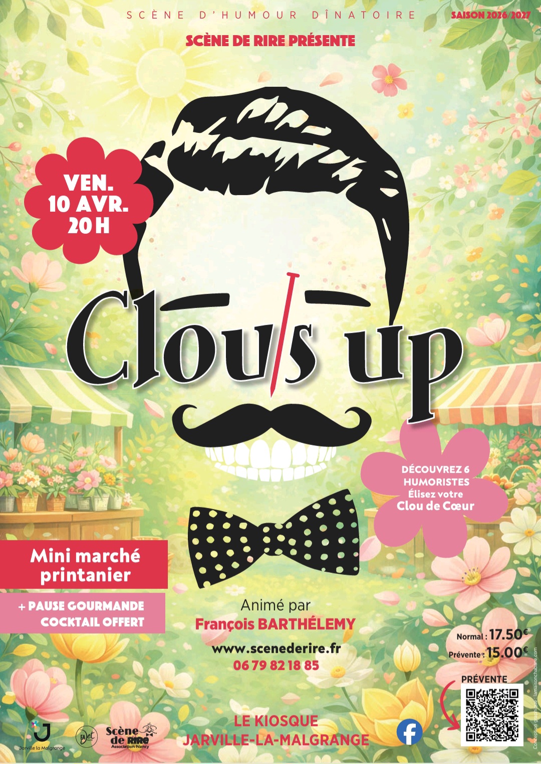 Billetterie : https://www.helloasso.com/associations/scene-de-rire/evenements/clou-s-up-scene-d-humour-dinatoire-3